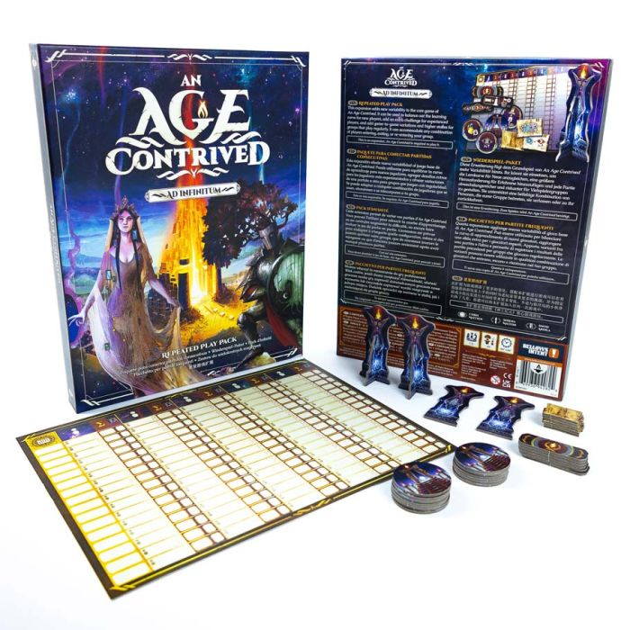 Ad Infinitum introduces new variability to the base game of An Age Contrived, as well as cosmetic trophy pieces to celebrate your victories. This expansion has 3 modules: Advancement Tokens, Achievement Tokens, and Infinitum Benefit Tokens.