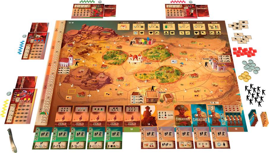 Cangaceiros is a strategic competitive game for 2 to 5 players in which each player plays a gang that tries to survive in the hostile desert territories, hunted by the Volantes, the state police trained to kill them. Each band will have a chief to choose from the 20 available, each with its own unique abilities and characteristics. The management of each 7 card deck is fundamental, such as collecting resources, placing bandits to guard a region, attacking the Volantes, assaulting the prison of the city of Recife, convert the accumulated resources into fame, train their leader and recruit new members for the gang. The different chiefs, the initial setup of cards and resources, the events and life goals distributed randomly make each game profoundly different from the other, offering a high re-playability