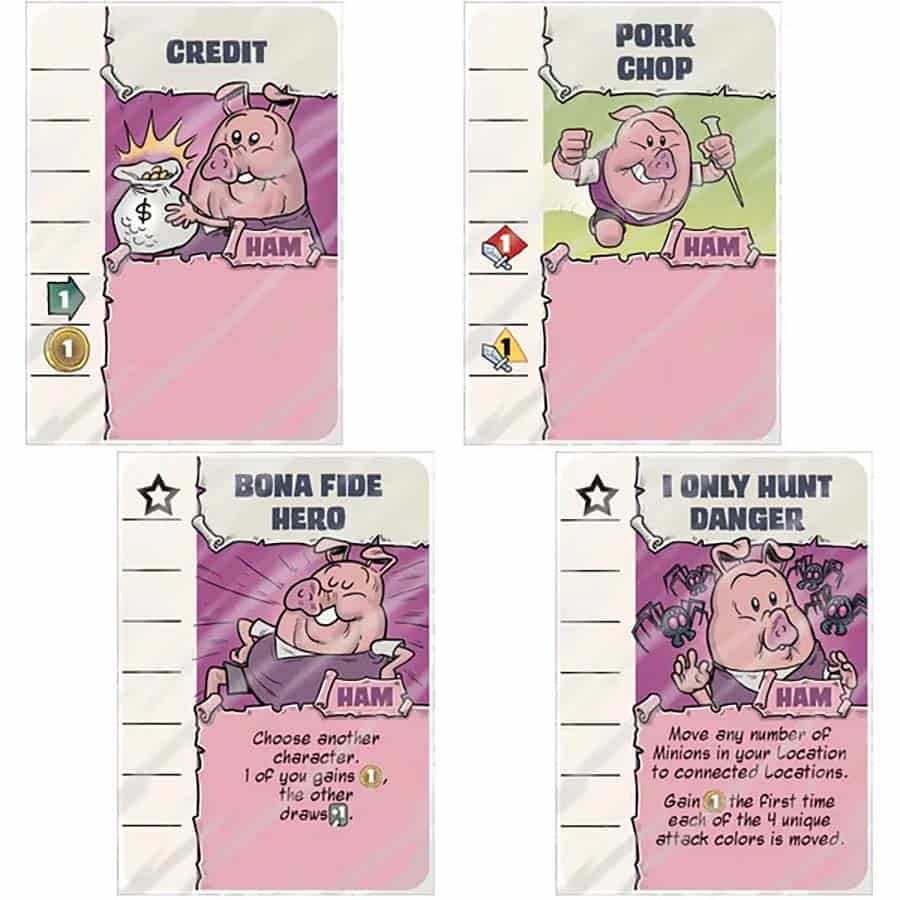 Pick a character and grab your starting deck; each character has a special ability and their own deck with custom cards that fit their style of play. On your turn, use the symbols on the cards in your hand to travel to new locations (some of which allow special actions), to defeat minions before they overrun a location (each of which has a limit), and to use Knuckles (the "fearless" mercenary bear) to scare off minions. When battling minions, you need to match the colors of the minion with the color of your attack to defeat them. There are four different colors to match, and some minions take two colors to defeat, so plan your card play carefully, and don't get pig-headed. Some minions will bite back, so keep an eye on your health as well.