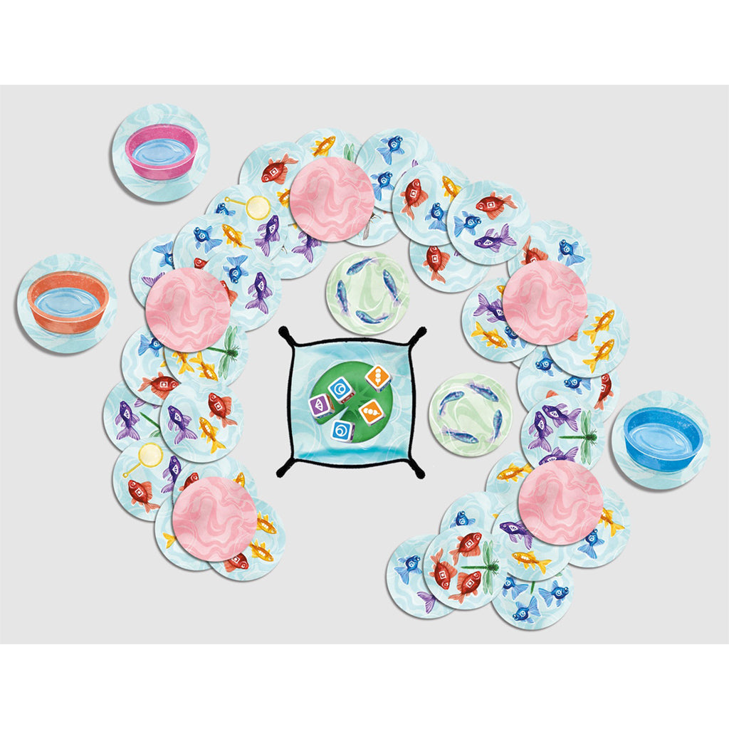 The Kingyo cards are laid out around the 5 dice. Players can divide themselves into teams as they wish. Each player takes a Bowl card to place the Kingyo cards they will catch.