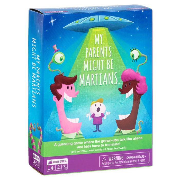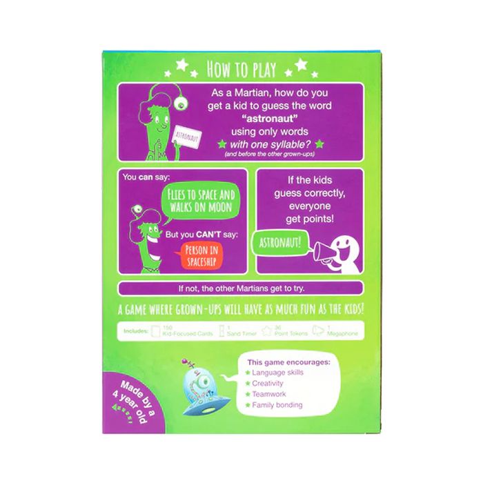 The goal is for the Martians to get their Human friends to guess a word by only using clues with single-syllable words. The Humans have to work together to make sense of your silly speech before the timer runs out. This game is an out-of-this-world way to improve your little ones’ teamwork and language skills.