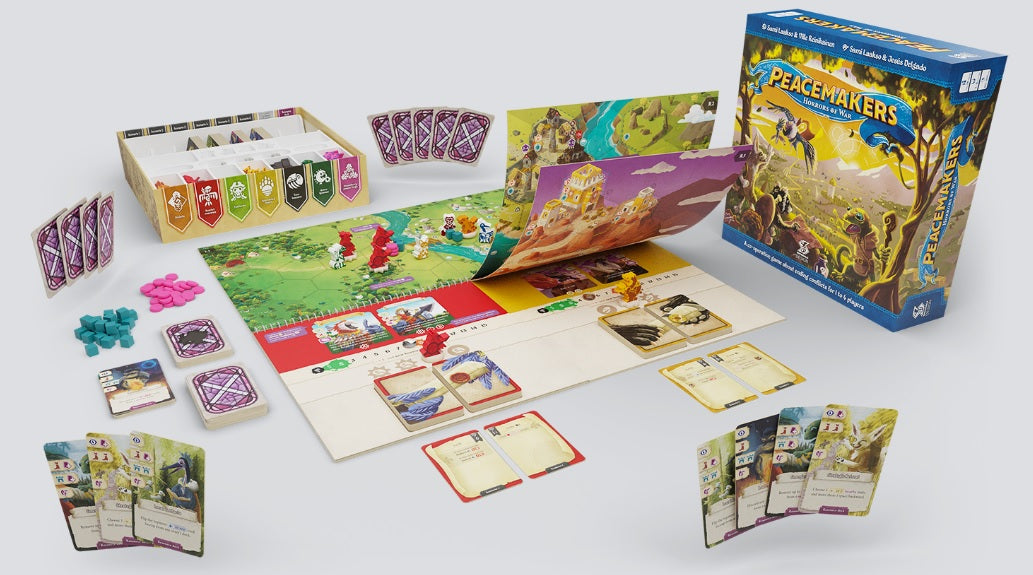 Peacemakers: Horrors of War is a thematic co-operative board game where you attempt to bring peace. The game can be played with up to 4 players, including solo. As an adventurer, you try to stop armed conflicts between animalfolk nations. Do your best to avoid the horrors a destructive war would inflict.The armies in the game act independently, so you cannot control them directly. Instead, you get multi-use resource cards, which you can use to thwart their plans. You only get a few new cards each round, so you have to figure out when and how to make the best use of them.
