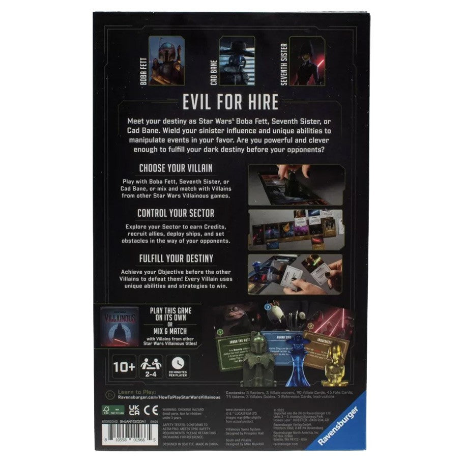 In Star Wars Villainous: Scum and Villainy, players choose to play one of three iconic villains from the Star Wars galaxy, including Boba Fett. Depending on their villain's unique power, players will use their villain's "ambition" to perform actions that power effects based on the villain's use of the Force, strategic leadership, or sheer luck. The game also incorporates villain-specific missions and rules for iconic ships and transports from all corners of the Star Wars galaxy.
