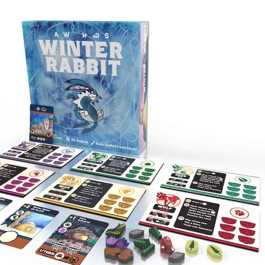 The village elders have predicted a severe winter, and so the villagers have agreed to work together to ensure that the village has all of the necessities. In a spirit of healthy competition, the villagers have decided to compete to see who can be the most helpful. However, Rabbit, the constant trickster, has decided that he does not want to work. Instead, he has decided to confuse everyone else so that he can take all of the resources for himself. Winter Rabbit is set in the world of traditional Cherokee animal stories, where each player takes on the role of one of the animal characters. In this semi-cooperative game, players cooperate to provide everything the village needs for winter while also competing to see who can contribute the most.